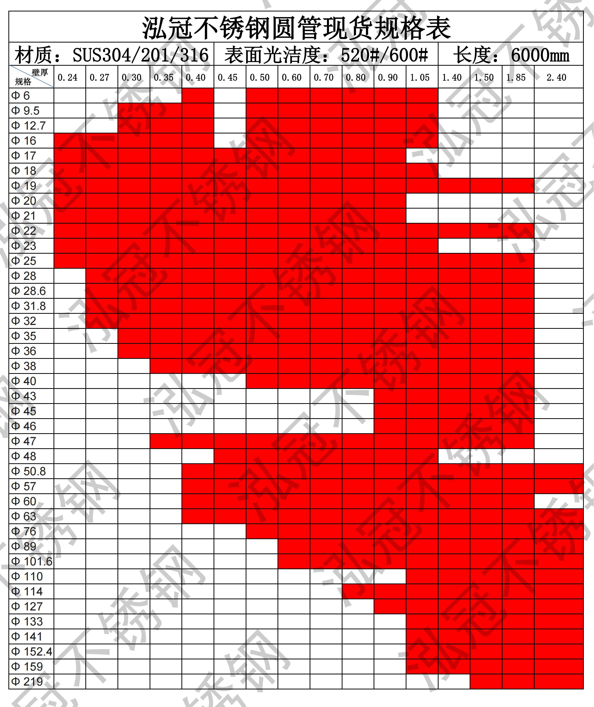 泓冠不銹鋼圓管現(xiàn)貨規(guī)格表